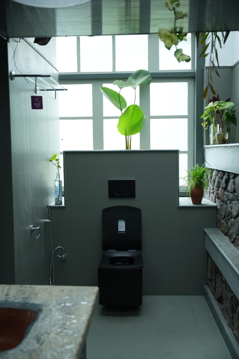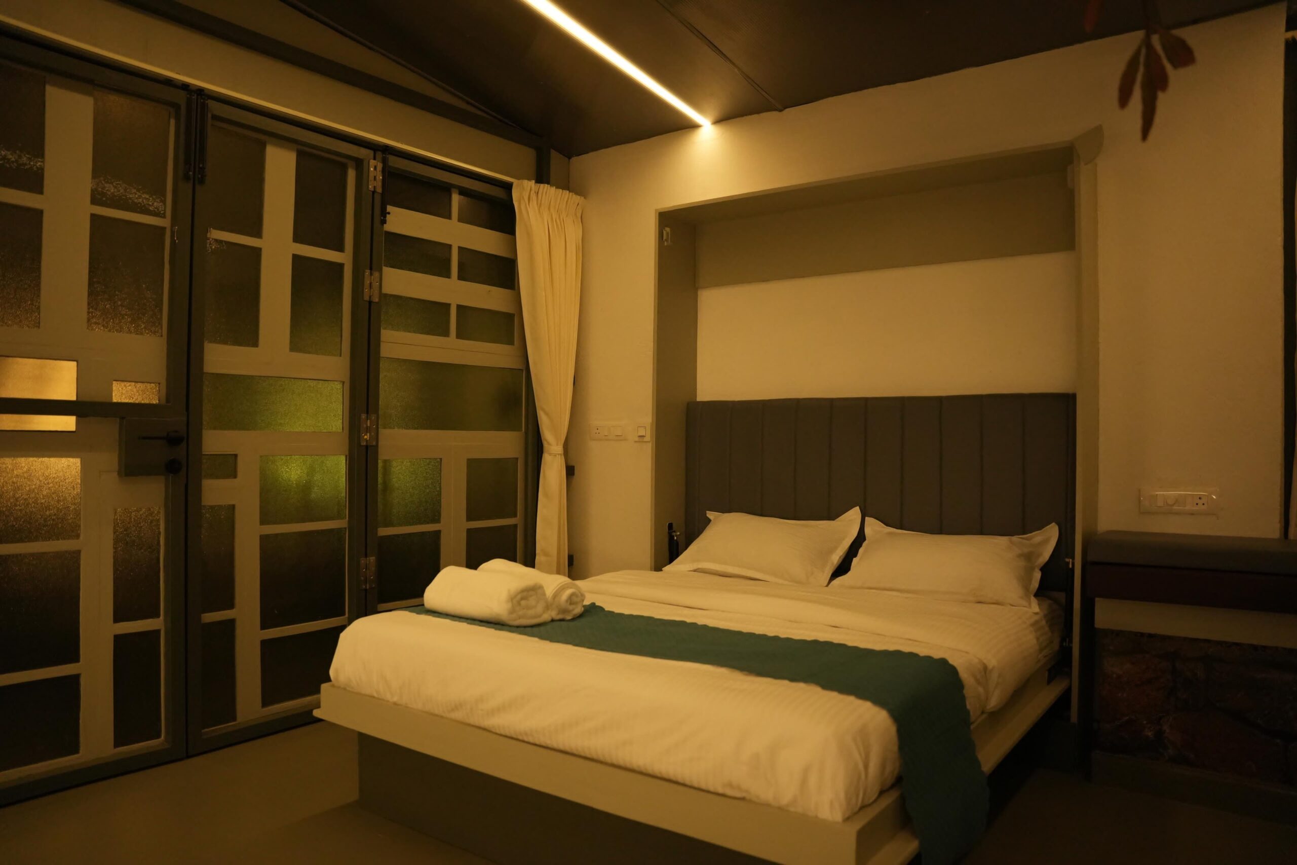 A uniquely designed queen room, where one wall is beautifully crafted from a cascade of old windows. Fitted with opaque glass and long, flowing curtains, it creates a play of light and texture while ensuring privacy. A petite garden-view window completes the charm, making it a cozy retreat filled with character.